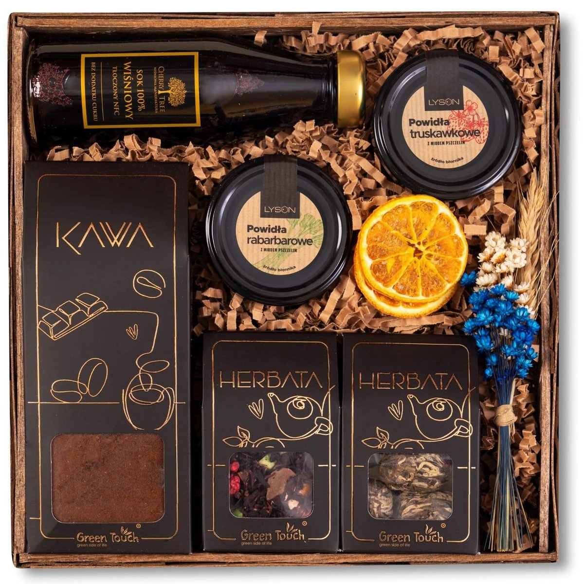 Kosz prezentowy zestaw herbat kwitnących kawa sok powidła kwiaty prezent