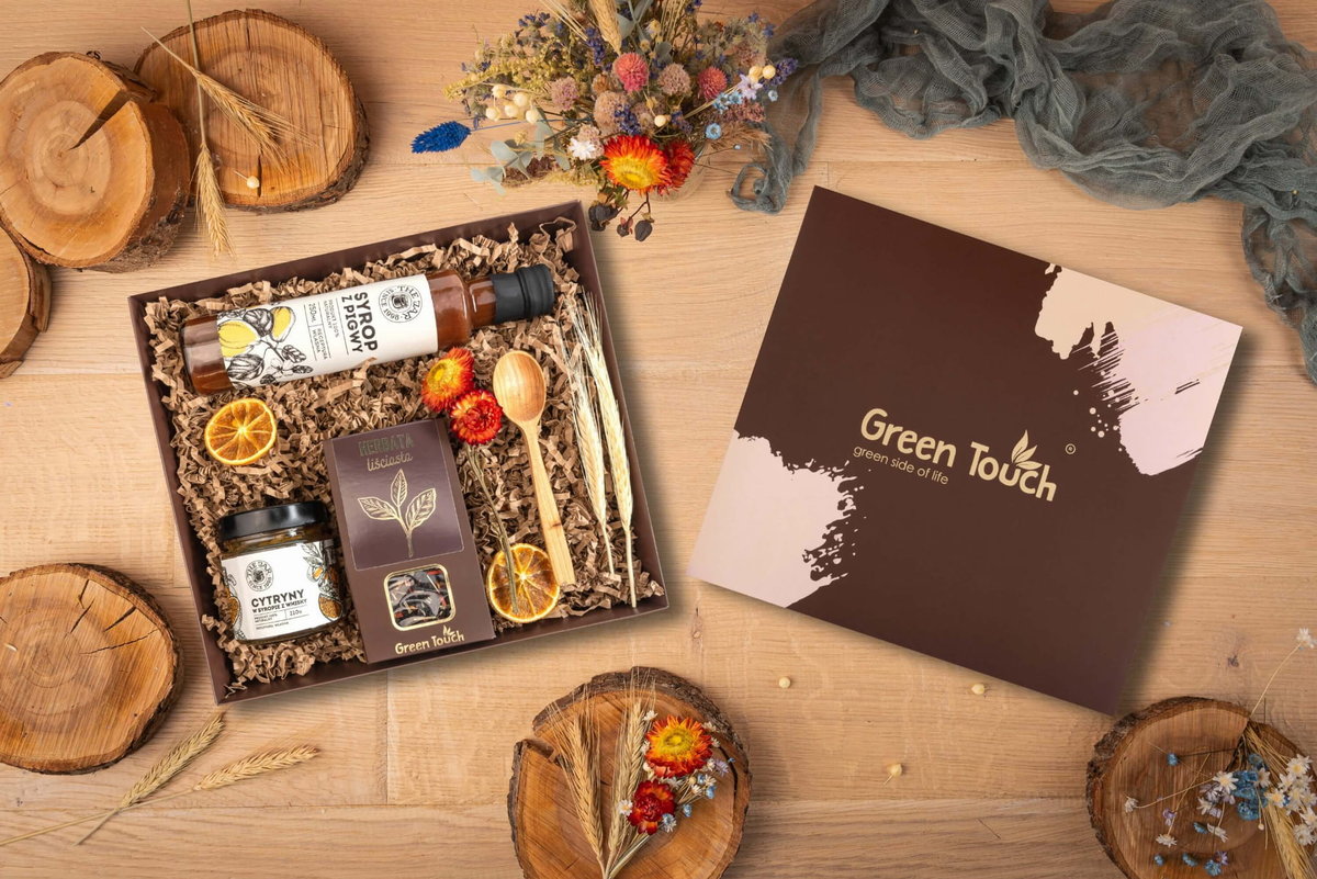 Prezent od Green Touch to doskonały wybór dla miłośników wykwintnych smaków i pięknych prezentacji. W eleganckim pudełku zamykanym nakładanym wiekiem znajdziesz czarną herbatę liściastą z owocami;syrop z pigwy oraz cytryny w syropie z whisky - wszystko w najwyższej jakości i starannie wyselekcjonowane przez Green Touch.