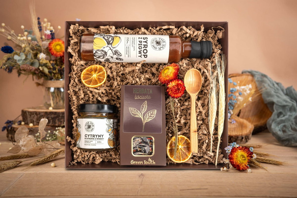 Eleganckie pudełko prezentowe Green Touch z herbatą;syropem z pigwy;cytrynami w syropie z whisky;łyżeczką i ozdobami. Gotowe do wręczenia;idealne dla miłośników smaków i aromatów.