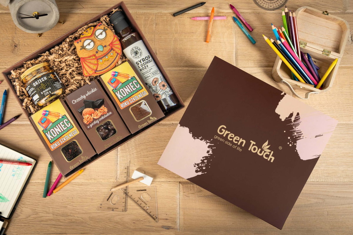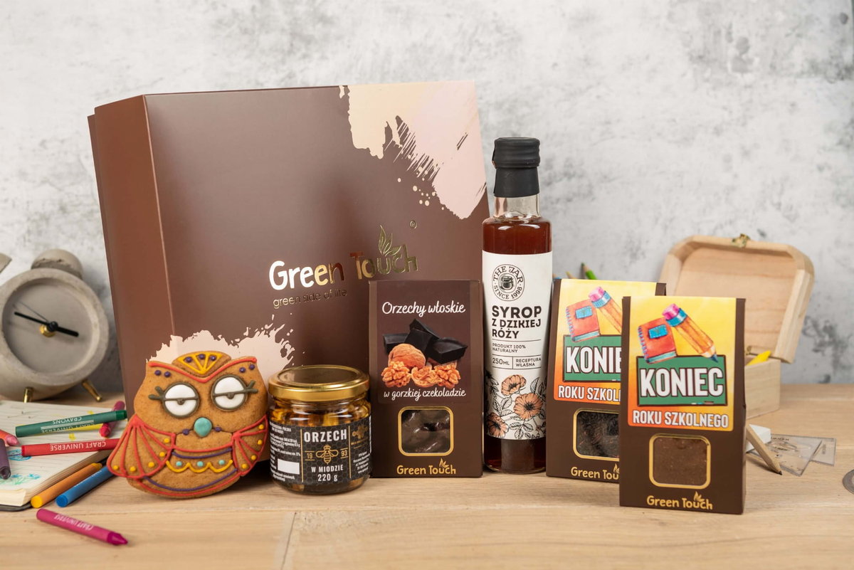 Zestaw prezentowy Green Touch dla nauczyciela to doskonały sposób na podziękowanie na koniec roku szkolnego. Zestaw zawiera kawę mieloną 100% arabica;czarną herbatę liściastą;orzechy w gorzkiej czekoladzie;naturalny piernik w kształcie sowy;syrop z dzikiej róży i orzechy włoskie i laskowe w miodzie. Zapakowane w eleganckim opakowaniu z nadrukiem.