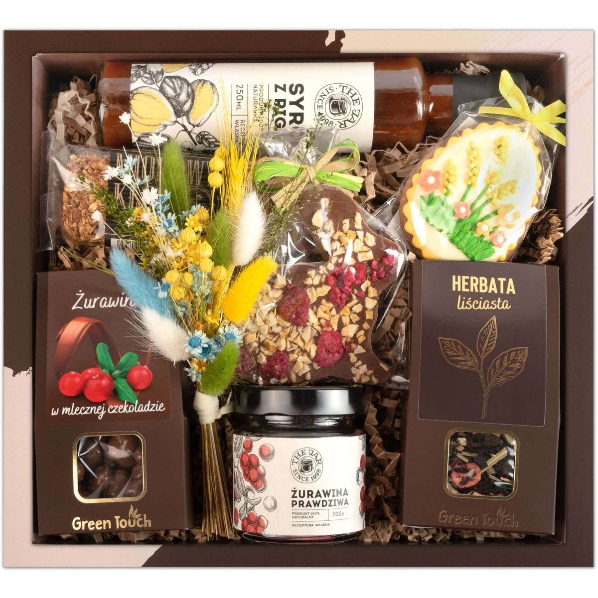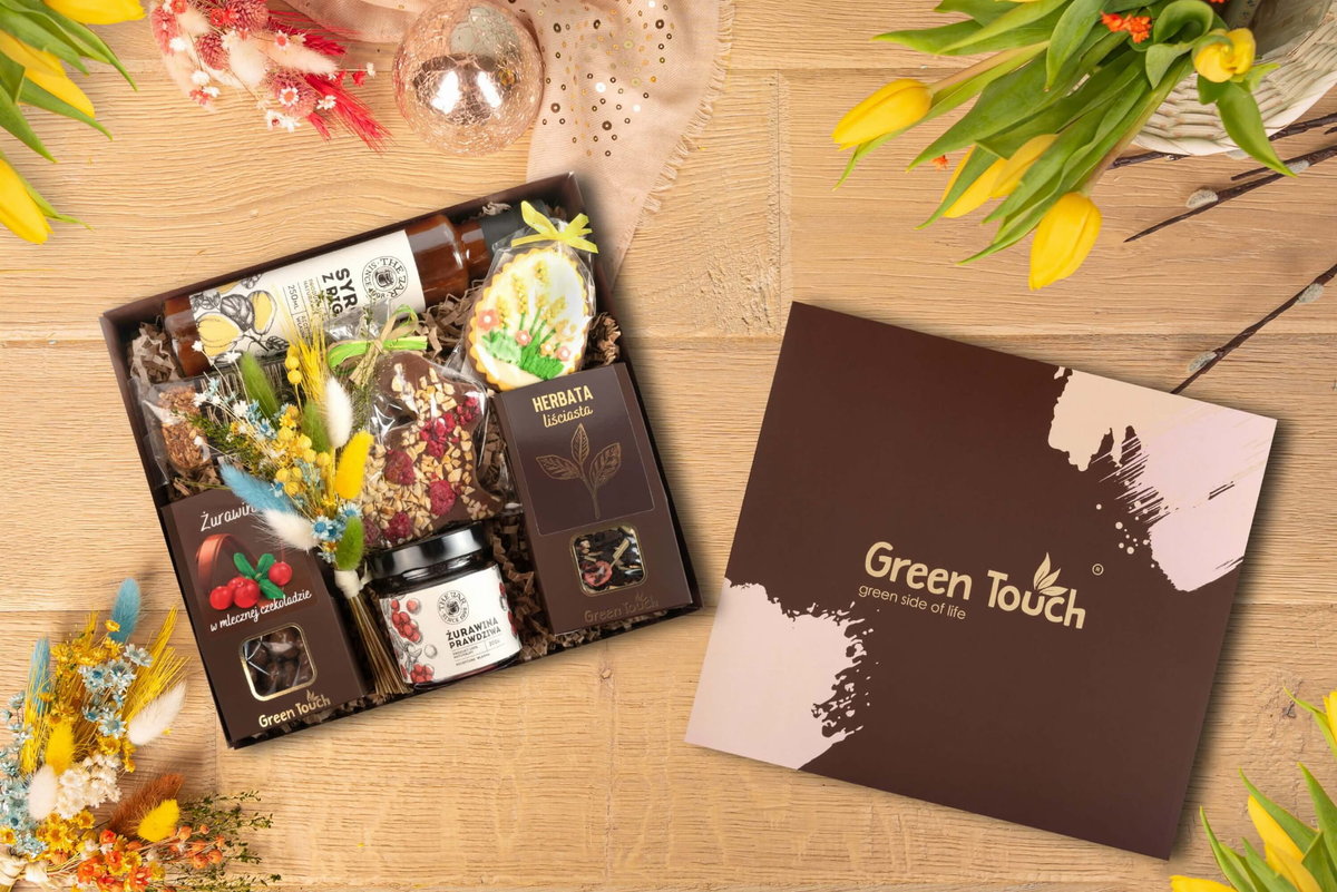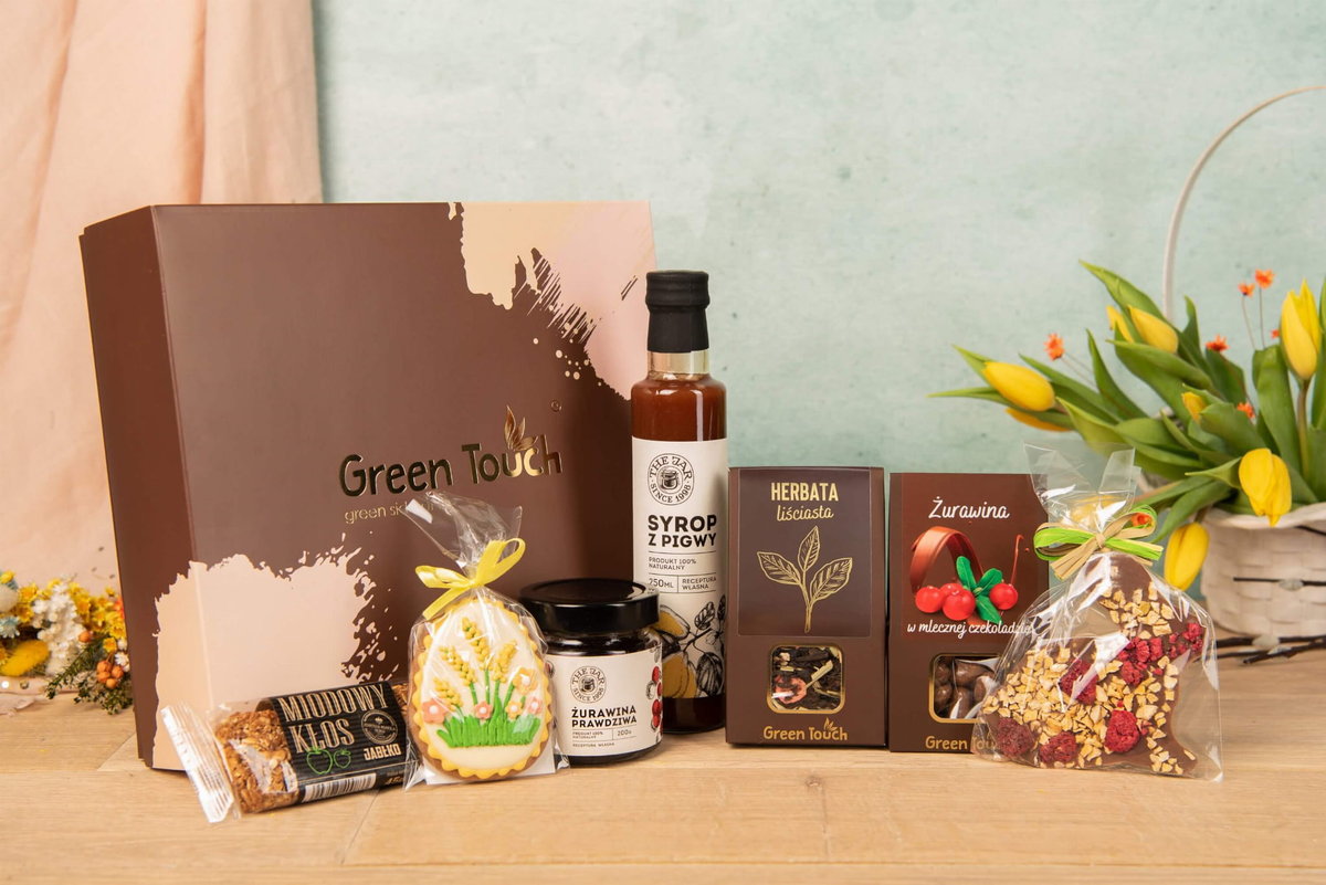 Zestaw słodkości Green Touch to idealna propozycja dla miłośników naturalnych smaków. W skład wchodzą m.in. herbatka z owocami;żurawina w mlecznej czekoladzie;czekolada w kształcie zająca wielkanocnego;piernik;syrop z pigwy;konfitura z żurawiny i miodowy kłos z jabłkiem. Wszystko zamknięte w eleganckim pudełku prezentowym.