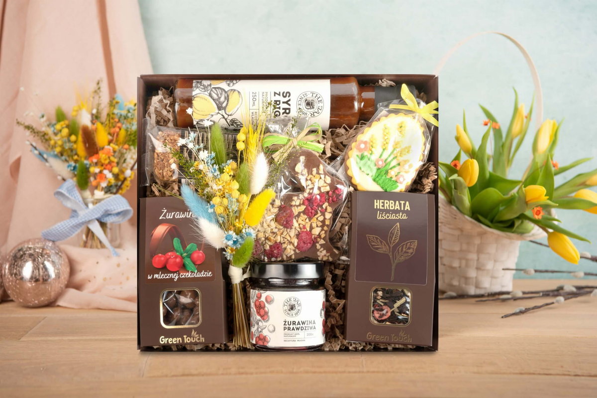 Kosz prezentowy zestaw prezent na Wielkanoc słodycze;kwiaty;herbata;przetwory Zestaw słodkości Green Touch to idealna propozycja dla miłośników naturalnych smaków. W skład wchodzą m.in. herbatka z