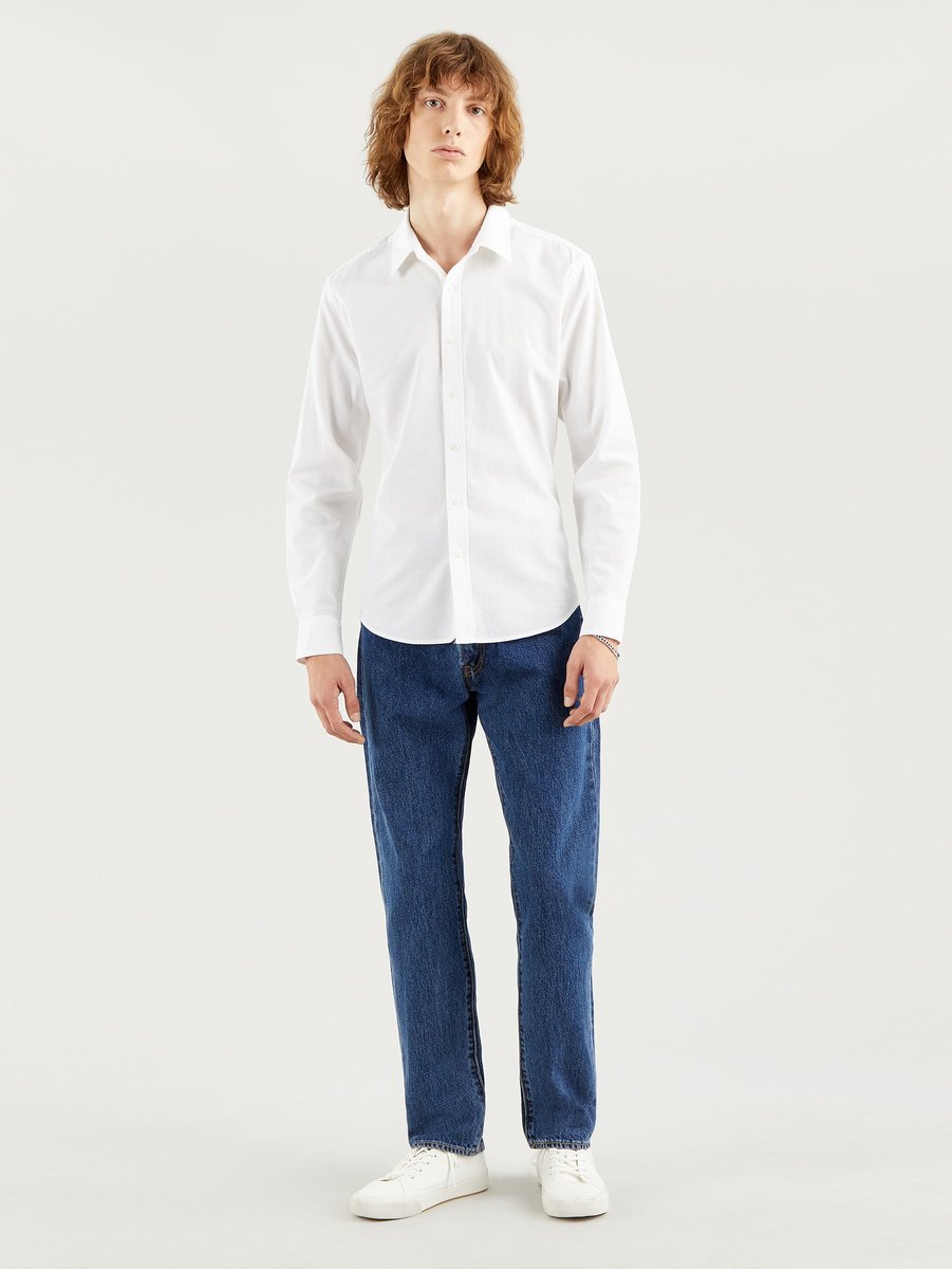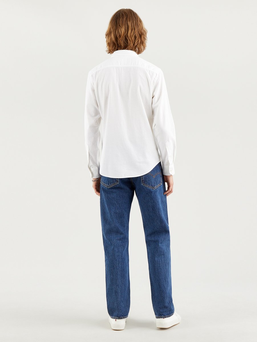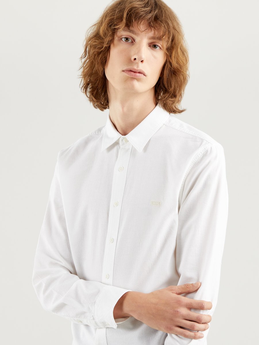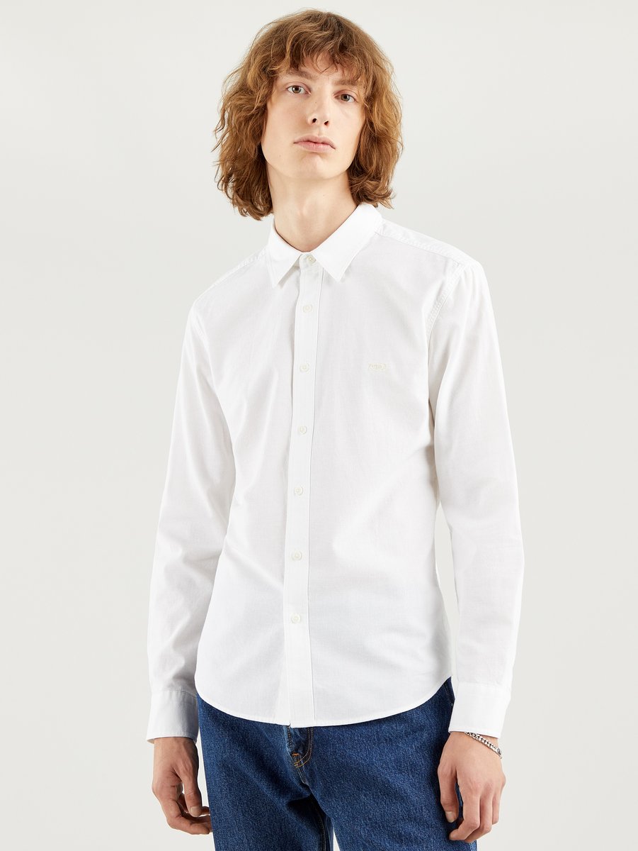 Koszula męska Levi's® w białym kolorze, zapinana na guziki, z minimalistycznym logo na lewej piersi, zaokrąglona na dole.