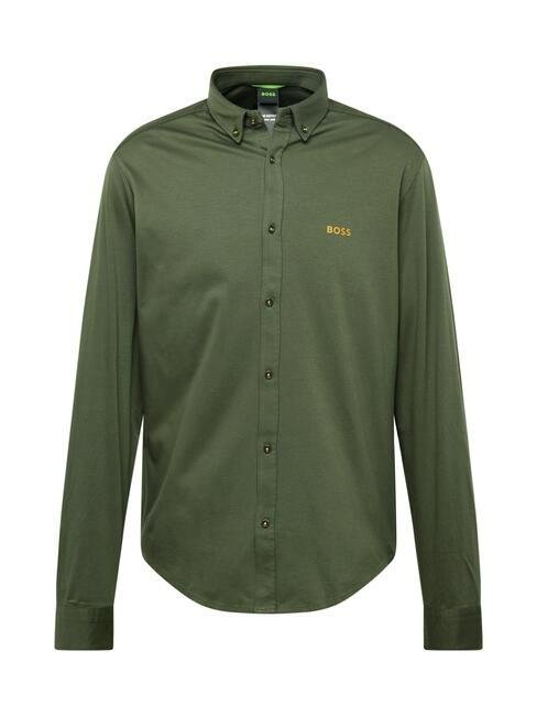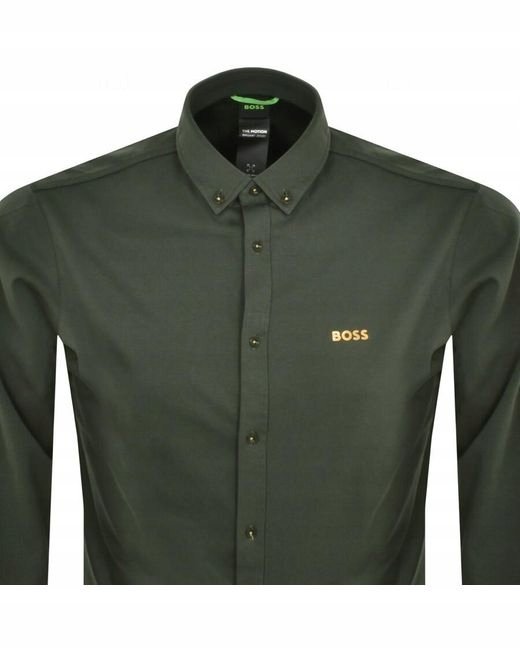 Koszula z długim rękawem BOSS B Motion L w kolorze ciemnozielonym, o regularnym, elastycznym kroju. Wykonany z oddychającego i rozciągliwego w czterech kierunkach materiału, który nie gniecie się. Zapięcie na markowe guziki z przodu, standardowy kołnierzyk koszuli zapinany na guziki oraz regulowane mankiety zapinane na markowe guziki na długich rękawach, wszystkie z kontrastowymi jasnożółtymi szwami. Charakterystyczne logo BOSS jest wypukłe i gumowane po lewej stronie klatki piersiowej w kolorze złotym. Zakrzywiony dół i szwy u góry w kolorze ciemnozielonym.