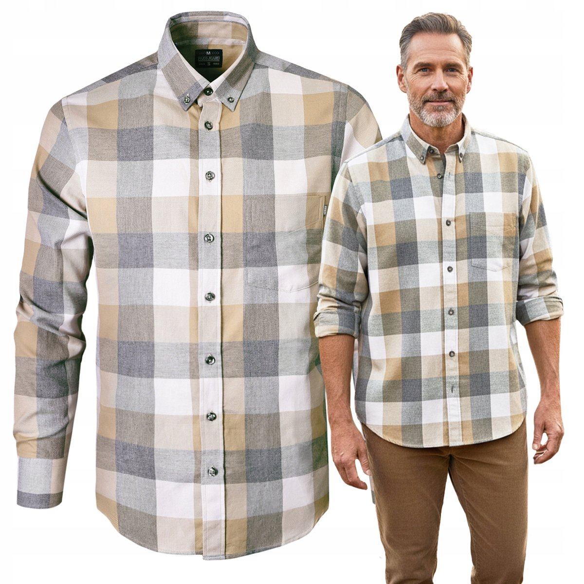 Model wyróżnia się ponadczasowym wzorem w dużą kratę w odcieniach beżu, szarości i bieli, które nadają całości naturalnego, casualowego charakteru. Koszula posiada kołnierzyk button-down oraz kieszonkę na piersi, dzięki czemu łączy klasykę z wygodą.