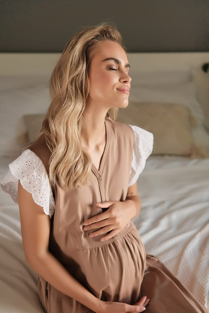 Damska koszula nocna w jasno brązowym kolorze oczaruje każdą kobietę. Dzięki praktycznemu zapięciu na napy, koszula świetnie sprawdzi się dla mam karmiących piersią. Ponadczasowy krój, praktyczny w okresie ciąży i w pierwszych tygodniach w domu. Koszula nocna świetnie układa się również bez brzuszka. Posiada rękawy wykończone z białej koronki oraz dwie, praktyczne kieszenie po bokach.