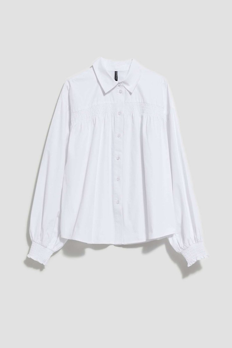 60%POLIESTER, 40%BAWEŁNA Elegancka, biała koszula z bufiastymi, długimi rękawami zakończonymi szerokim ściągaczem. Bogate marszczenia i ściągacze przy dekolcie z przodu i na plecach. Luźny, rozkloszowany, ponadczasowy krój zapewnia wygodę i swobodę ruchów. Koszula z klasycznym, wykładanym kołnierzykiem. Zapinana na białe, drobne guziki. Dół koszuli delikatnie zaokrąglony luźno opadający na sylwetkę. Z uwagi na luźny krój najlepiej zestawić ją z wąskimi, gładkimi spodniami.