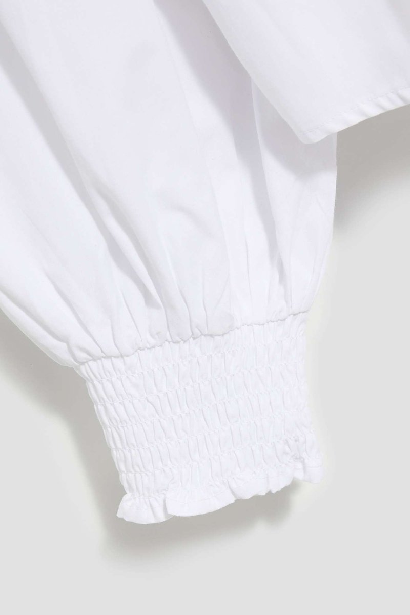 60%POLIESTER, 40%BAWEŁNA Elegancka, biała koszula z bufiastymi, długimi rękawami zakończonymi szerokim ściągaczem. Bogate marszczenia i ściągacze przy dekolcie z przodu i na plecach. Luźny, ...