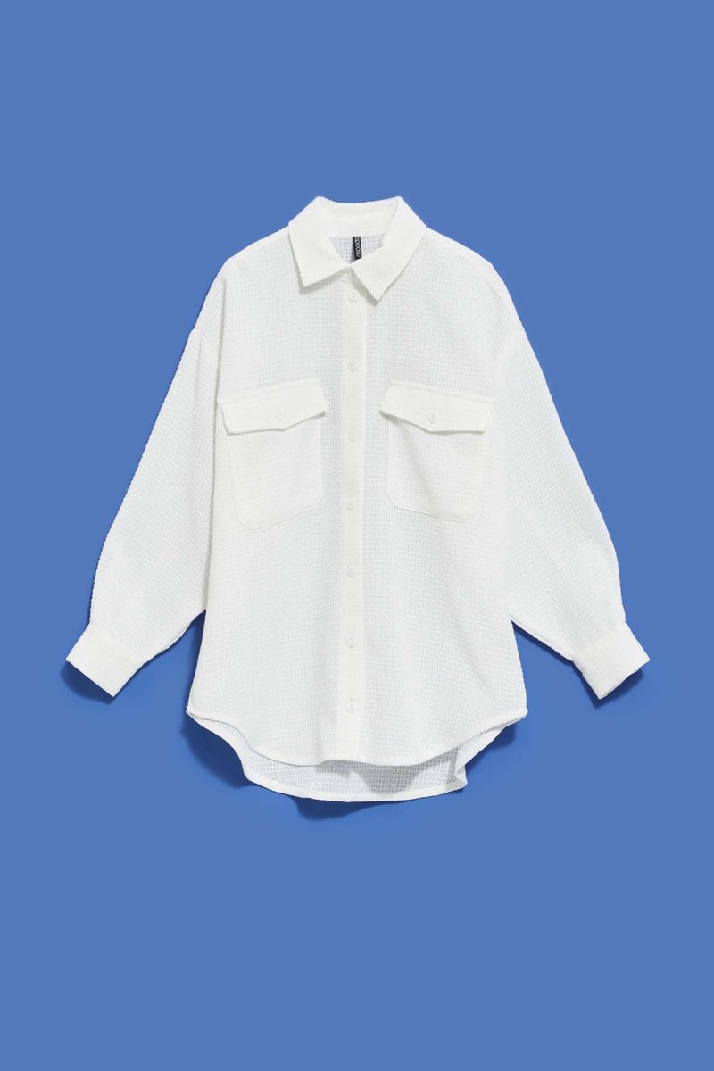 100%POLIESTER. Klasyczna biała koszula uszyta z ciekawej strukturalnej tkaniny. Długie, luźne rękawy z obniżoną linią ramion są wykończone na dole mankietem zapinanym na dwa białe guziki. Dwie duże kieszenie z klapami zapinanymi na guzik, wszyte są na przedzie, na wysokości klatki piersiowej. Klasyczny wykładany kołnierz, zapinany na guziki. Prosty, luźny krój z zaokrąglonym dołem. Tył koszuli jest dłuższy i sięga za pośladki. Koszula zapinana na białe guziki. Idealna na biznesowe spotkanie, jak i swobodne codzienne wyjścia. Pasuje do sportowych butów, jak i wysokich obcasów.