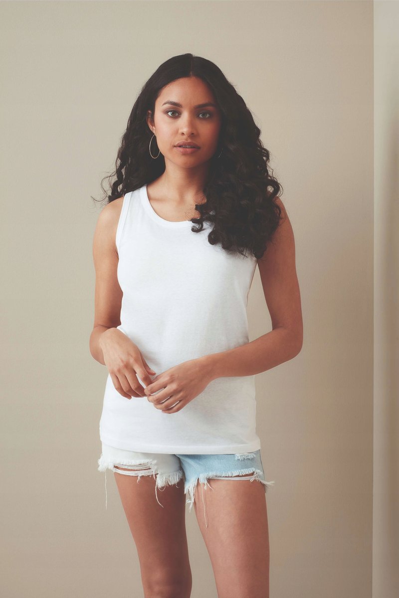 Miękki top bez rękawów dla kobiet, bez szwów bocznych, ściągacz na dekolcie i na ramionach, wykonany z wytrzymałej bawełny single jersey.