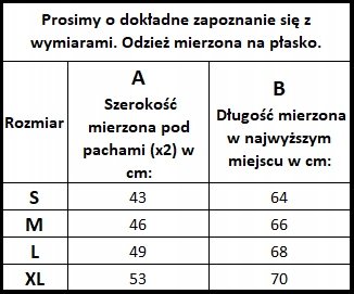 Bardzo prosimy o dokładne zapoznanie się z tabelą rozmiarową podaną poniżej dla tego modelu.