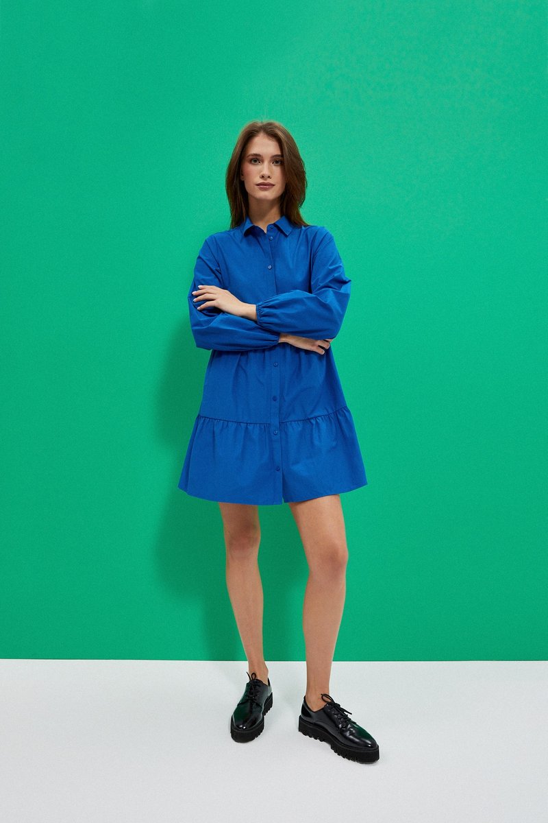 60%POLIESTER, 40%BAWEŁNA Bardzo kobieca bawełniana sukienka w kolorze niebieskim. Pod szyją klasyczny kołnierzyk. W dolnej części widoczne falbany. Długie rękawy zakończone ściągaczem. Całość zapinana na guziki. Idealna na popołudniowe spotkania z przyjaciółką.