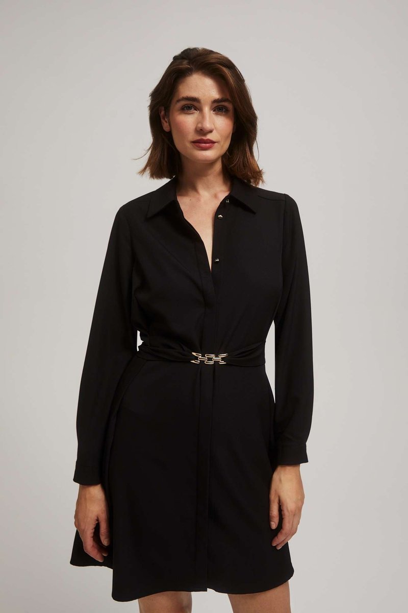 97% POLIESTER, 3% ELASTAN Czarna sukienka bez wzoru jest idealnym dodatkiem do Twojej garderoby. Wykonana z wysokiej jakości poliestru, gwarantuje wygodę i trwałość. Dzięki paskowi w talii, sukienka pięknie podkreśla kobiecą sylwetkę. Kołnierzyk i guziki dodają jej elegancji i klasy. Jej klasyczny fason oraz rozkloszowany krój sprawiają, że nadaje się zarówno na specjalne okazje, jak i do pracy. Sukienka sięga do połowy uda, co dodaje jej subtelnego uroku.