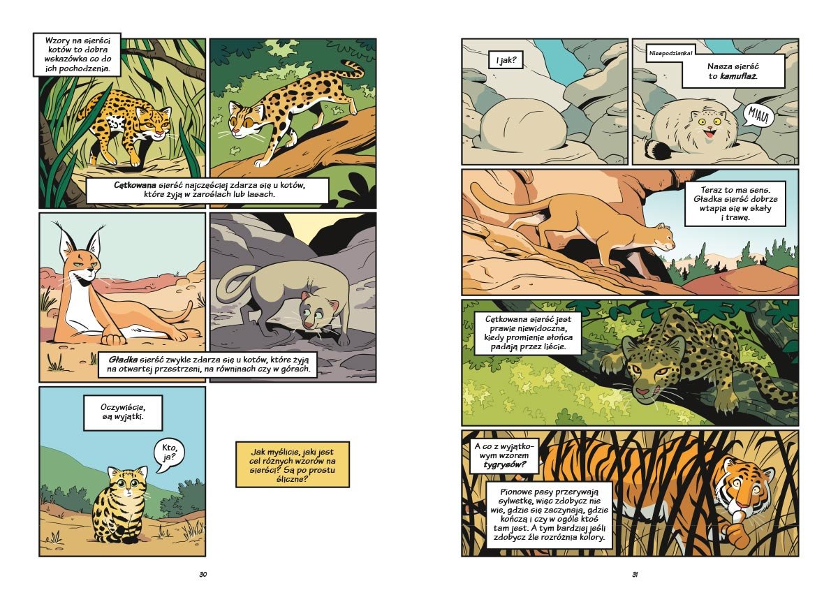 Dlaczego koty mruczą? Po co lampartom cętki? Czy trzymanie lwa w domu to dobry pomysł? Jak te drapieżniki, wyposażone w zęby, pazury i umiejętności pozwalające im przeżyć w niemal każdym środowisku, stały się towarzyszami ludzi? Dowiedz się więcej o naszych pręgowanych i łaciatych przyjaciołach. Poznaj zarówno malutkiego ocelota chilijskiego, jak i potężnego tygrysa oraz odkryj, co czyni twojego kociaka tak wyjątkowym.