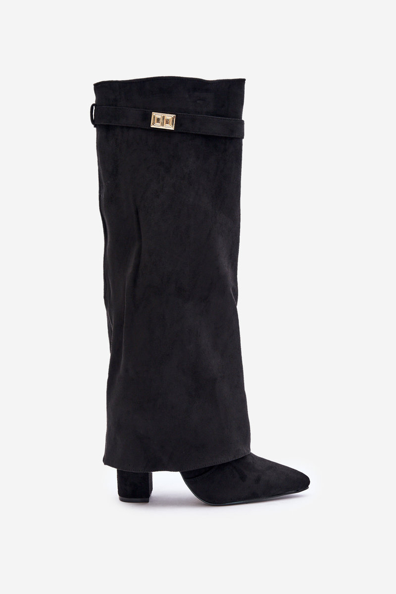 Eleganckie damskie kozaki z ekologicznego zamszu. Osadzone na obcasie w formie słupka. Noski w szpic. Wnętrze zostało ocieplone kocem obuwniczym. Wyjątkowym elementem tego modelu jest wywinięta cholewka z odpinanym paskiem na górze cholewki, która zachodzi na obcas. Zapięcie na suwak. Doskonałe do noszenia z sukienkami lub spódnicami! Przy wyborze rozmiaru prosimy sugerować się tabelą rozmiarów. 36-23/37-24/38-24,5/39-25/40-25,5/41-26cm