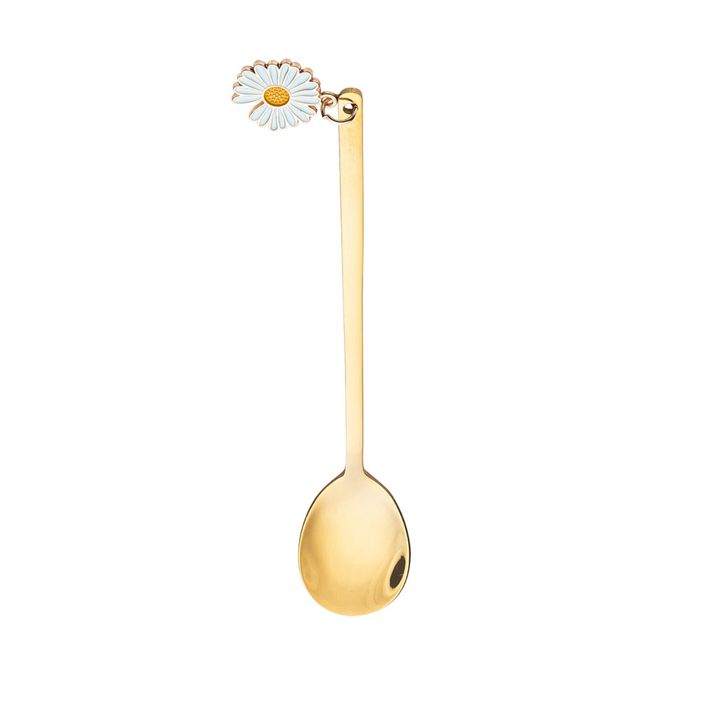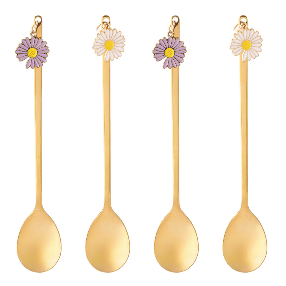 Oto elegancki zestaw 4 łyżeczek w odcieniu złota, które stanowią doskonałe połączenie stylu i funkcjonalności. Wykonane z wysokiej jakości stali nierdzewnej, łyżeczki są nie tylko trwałe, ale również odporne na korozję, co zapewnia ich długowieczność. Każda łyżeczka ozdobiona jest urokliwą zawieszką w kształcie kwiata, co dodaje im wyjątkowego charakteru i sprawia, że idealnie nadają się na prezent lub do eleganckiej aranżacji stołu.