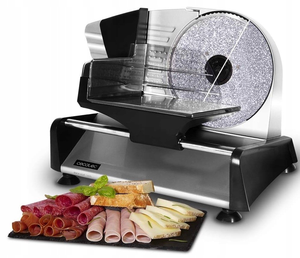 Krajalnica o mocy 180 W z 2 wymiennymi tarczami do krojenia mięsa lub chleba, z nieprzywierającą powłoką RockStone, dokładność grubości do 15 mm