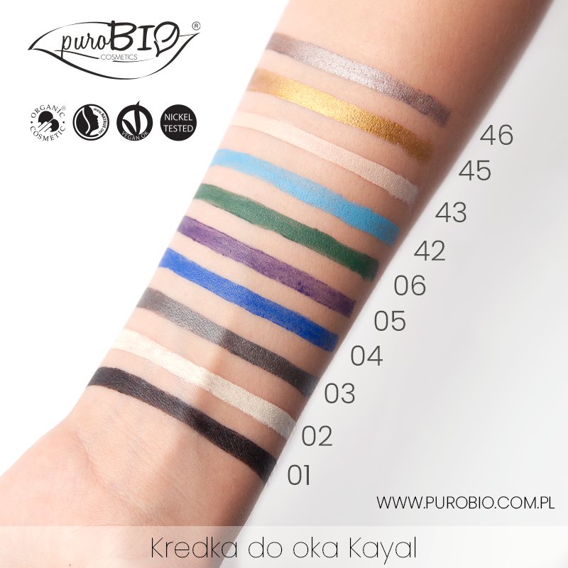 Kredka do oczu Kayal 06 zielona puroBIO⭐ Konturówka do oka o intensywnych kolorach i bardzo dobrej pigmentacji. Miękka, łatwa do rozprowadzania, a także precyzyjna. Formuła zawiera cenne woski i ...
