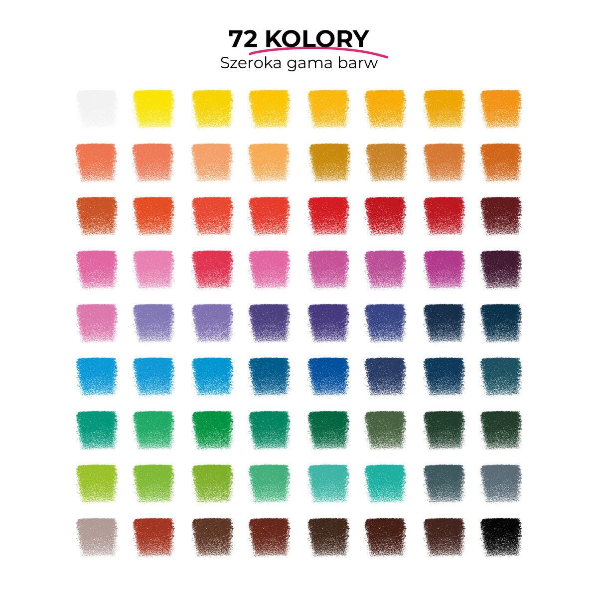 Zachwyci Cię aksamitna, kremowa tekstura 72 kredek, które z łatwością rozprowadzają się po kartce, pozwalając na cieniowanie i idealne łączenie barw.