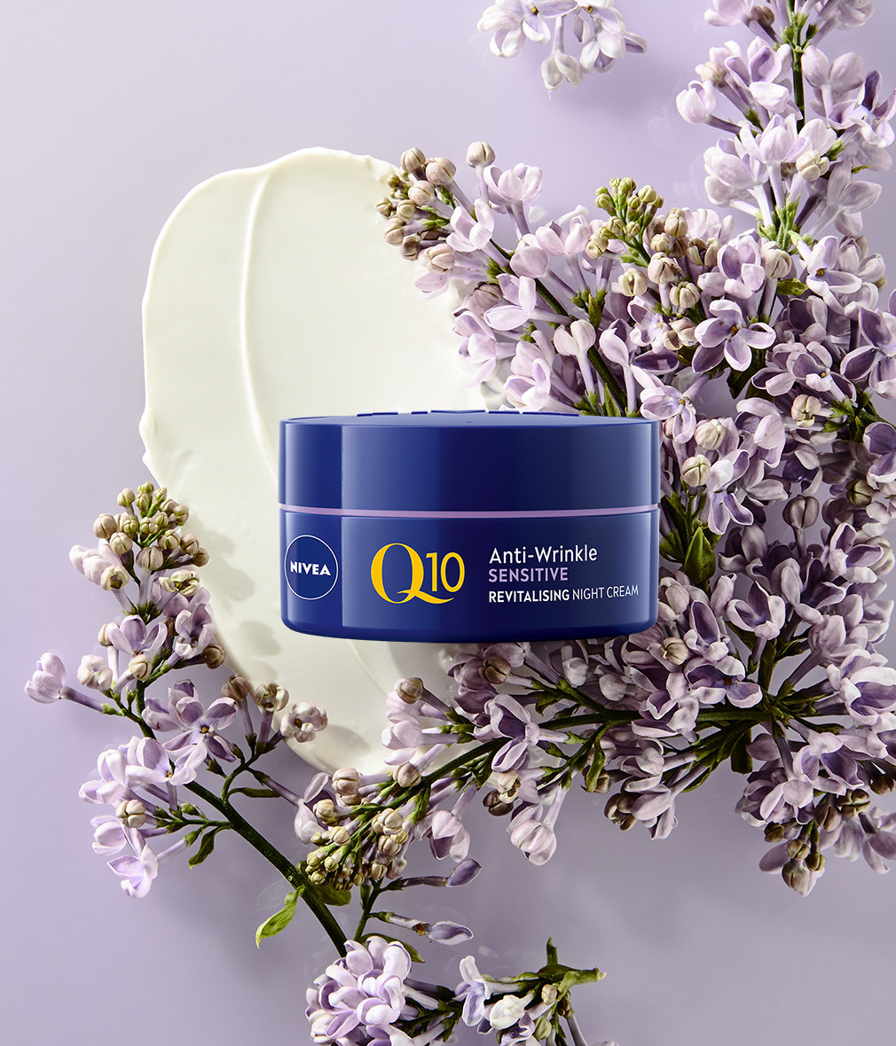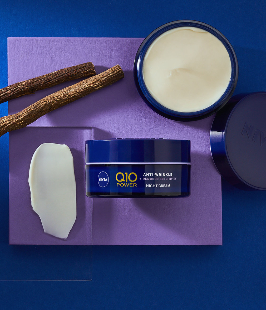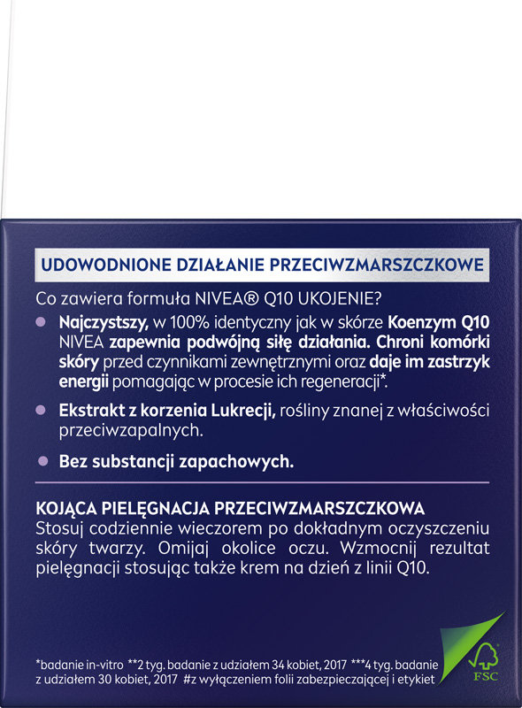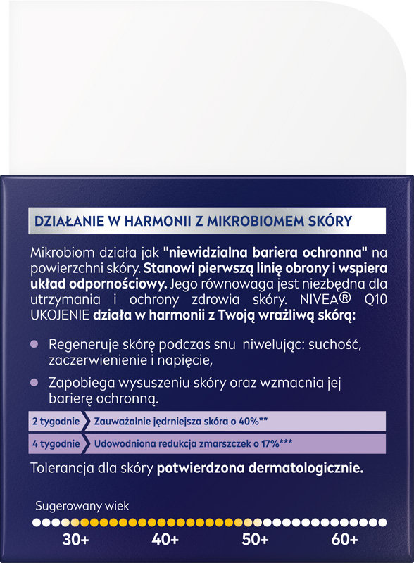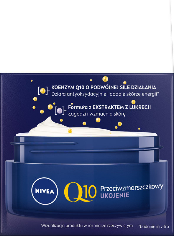 NIVEA Q10 UKOJENIE Przeciwzmarszczkowy krem na noc do cery wrażliwej działa w harmonii ze mikrobiomem skóry. Formuła o udowodnionym działaniu przeciwzmarszczkowym zawiera najczystszy, w 100% identyczny jak w skórze Koenzym Q10. Chroni komórki skóry przed czynnikami zewnętrznymi oraz daje im zastrzyk energii, pomagając w procesie ich regeneracji*. Formuła kremu została wzbogacona o ekstrakt z korzenia lukrecji - rośliny znanej z właściwości przeciwzapalnych. Nie zawiera substancji zapachowych, które mogą podrażnić wrażliwą skórę. Formuła kremu regeneruje skórę podczas snu niwelując suchość, zaczerwienienie i napięcie oraz zapobiega wysuszeniu skóry oraz wzmacniające jej barierę ochronną.