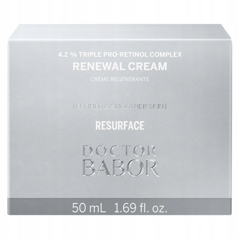 Doctor Babor Resurface 4,2 % Triple Pro-Retionol Complex Renewal Cream to krem do twarzy z potrójnym aktywnym kompleksem Pro-Retinol, który przywraca skórze gładkość i delikatną strukturę. Doctor Babor Resurface Triple Pro-Retinol Renewal Cream jest następcą kremu Triple Pro-Retinol Renewal Cream, dzięki skutecznemu 4,2% kompleksowi Triple Pro-Retinol wspomaga proces odnowy skóry oraz poprawia jej elastyczność i jędrność. Wartościowe aminokwasy, niacynamid i witamina F pielęgnują kompleksowo skórę i wzmacniają jej naturalną barierę ochronną.