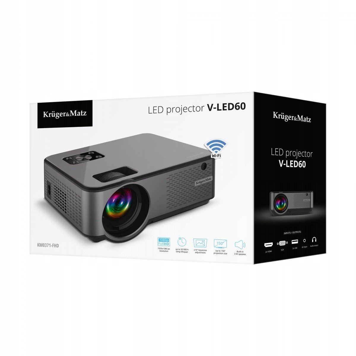 Projektor LED do domuPróbujesz zdecydować jaki projektor wybrać do domu? Koniecznie sprawdź projektor LED Kruger&Matz V-LED60! Urządzenie odtwarza materiały w rozdzielczości full HD, dlatego idealnie sprawdzi się do wyświetlania Twoich ulubionych programów i filmów.Projektor z Wi-FiNajwiększą zaletą Kruger&Matz V-LED60 jest łączność Wi-Fi, która zastąpi Ci niektóre funkcje telewizora z funkcją smart. Teraz nie tylko możesz przesyłać filmy i obrazy zapisane na telefonie czy komputerze, ale także wyświetlać materiały online z platform streamingowych, np. Netflixa lub serwisu YouTube za pomocą tych urządzeń. I to wszystko bez podłączania dodatkowych kabli!Szeroki zakres rozmiaru projekcjiUważasz, że 65-calowy telewizor to dużo? Projektor Kruger&Matz V-LED60 pozwala na wyświetlanie obrazów o przekątnej nawet 150. To prawie dwa razy więcej! Teraz za każdym razem oglądając film możesz czuć się jak na sali kinowej.Pokrętło regulacji KeystoneProjektor multimedialny Kruger&Matz został wyposażony w dwa pokrętła, którymi wygodnie dostosujesz ustawienia obrazu do własnych wymagań. Pierwszym ręcznie ustawisz ostrość, natomiast drugie pozwoli na korekcję zniekształceń trapezowych.Długa żywotność lampyWybierając projektor LED zwróć uwagę na żywotność lampy. Ta w projektorze Kruger&Matz V-LED60 posłuży nawet przez 50 000 godzin, co daje ponad 5 lat ciągłego oglądania. Ciesz się urządzeniem, które posłuży Ci na lata.Wejścia i wyjścia w projektorzeProjektor Kruger&Matz V-LED60 daje Ci szerokie możliwości, jeśli chodzi o wybór źródła odtwarzania. Do dyspozycji masz szereg portów: HDMI, USB, port VGA oraz wejście AV. Dzięki nim podłączysz dekoder cyfrowy, pendrive, laptopa, a nawet smartfon. Dodatkowo wyjście AUX umożliwi podłączenie zestawu głośników.Projektor z wbudowanym głośnikiemNie chcesz podłączać dodatkowych głośników? Projektor Kruger&Matz V-LED60 został wyposażony w głośnik z 5 trybami dźwięku i ręczną regulacją balansu. Sam zdecyduj, która opcja odpowiada Ci bardziej.Sterowanie za pomocą pilotaProjektor Kruger&Matz V-LED60 to także wygoda użytkowania. Do zestawu został dołączony pilot, dzięki któremu możesz np. wybierać źródło odtwarzania czy regulować głośność bez podnoszenia się z kanapy.Projektor montowany do statywuNie masz miejsca na półce czy stoliku? To żaden problem! Na spodzie projektora Kruger&Matz V-LED60 znajdziesz dwa gwinty, które umożliwiają montaż projektora do tripoda lub uchwytu.Torba na projektorCzęsto wyjeżdżasz i chcesz, by Twój projektor był chroniony w czasie podróży? W ofercie Kruger&Matz znajdziesz dedykowaną modelom z serii V-LED torbę. To niezwykle praktyczne i funkcjonalne akcesorium zapewni ochronę i łatwość transportu Twojego projektora LED.