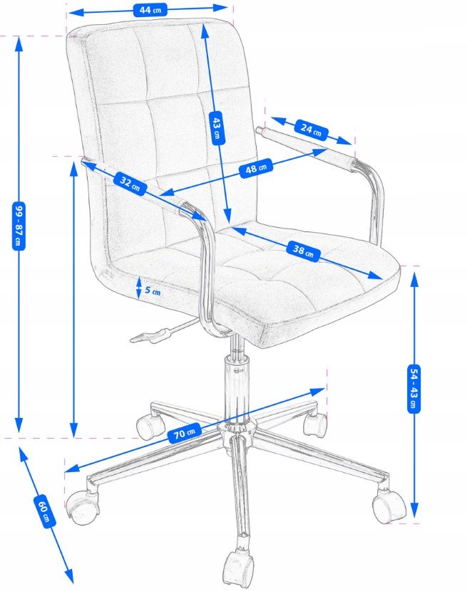 Krzesło posiada tapicerowane ekoskórą siedzisko z pikowaniem w kwadraty. Pięcioramienna podstawa zakończona niewielkimi kółkami daje dużą stabilność oraz zabezpiecza powierzchnię przed zarysowaniem. Krzesło posiada siłownik, który pozwala dostosować wysokość siedzenia do wymaganych potrzeb.