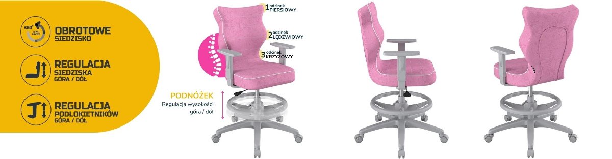 | Nazwa: | Entelo, Krzesło do biurka dla dziewczynki dopasowane do wzrostu 146-176,5 cm, model Duo z podnóżkiem kolor różowy obrotowe |