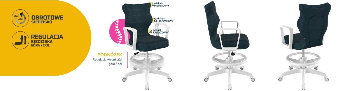 | Nazwa: | Entelo, Krzesło do biurka dla dziecka dopasowane do wzrostu 146-176,5 cm, model Norm z podnóżkiem kolor granatowy obrotowe |