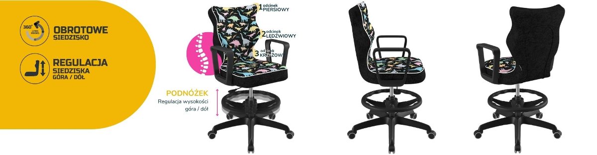 | Nazwa: | Entelo, Krzesło do biurka dla dziecka dopasowane do wzrostu 146-176,5 cm, model Norm z podnóżkiem motyw dinozary obrotowe |