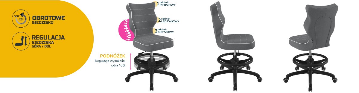 | Nazwa: | Entelo, Krzesło do biurka dla dziecka dopasowane do wzrostu 159-188 cm, model Petit z podnóżkiem kolor ciemny szary obrotowe |