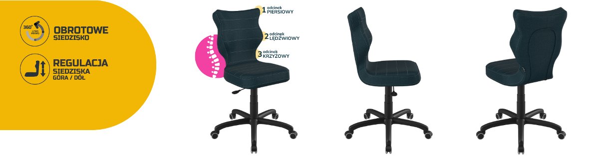 | Nazwa: | Entelo, Krzesło do biurka dla dziecka dopasowane do wzrostu 159-188 cm, model Petit granatowy obrotowe |