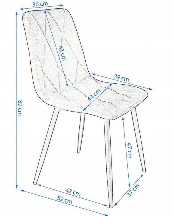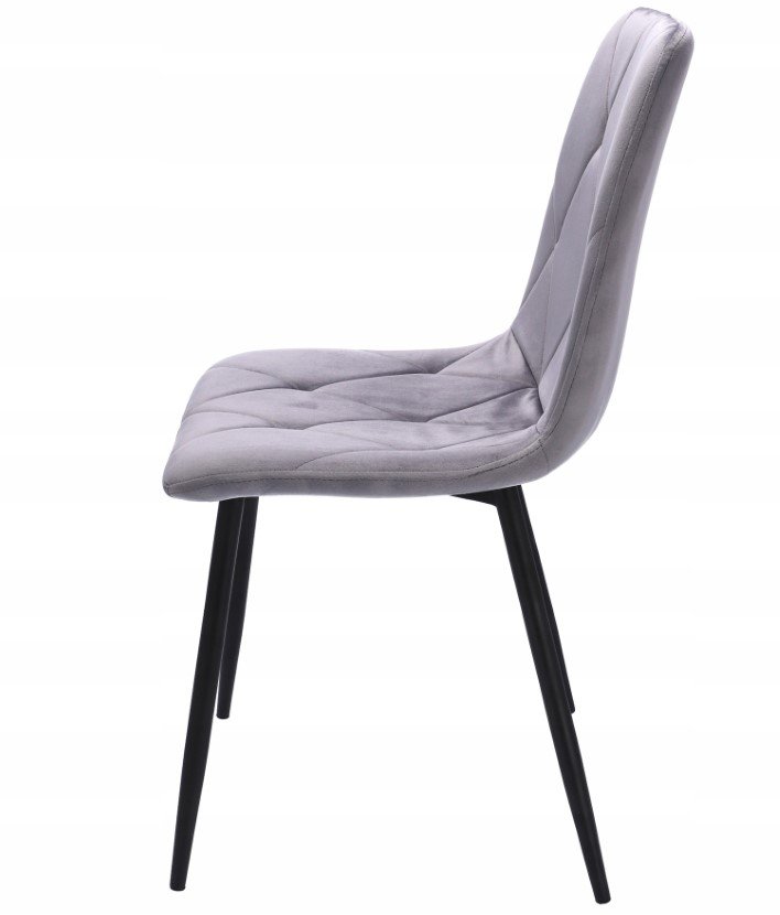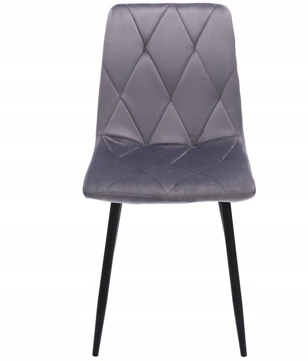 Krzesło tapicerowane jest welurem, a po wewnętrznej stronie pikowane regularnymi przeszyciami w romby. Wysokie i smukłe nóżki w czarnym kolorze wyglądają bardzo szykownie oraz gwarantują idealną stabilność.