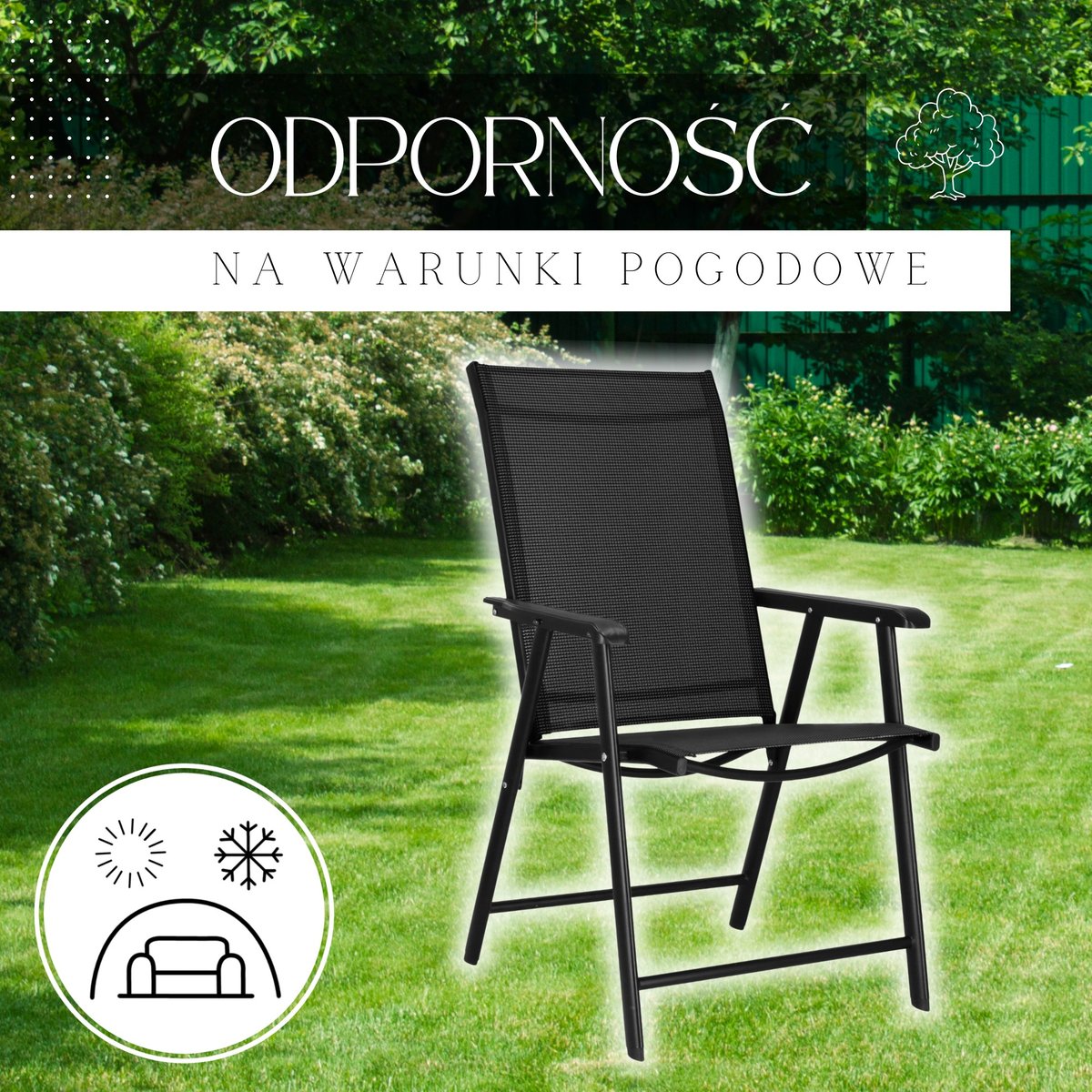 - Materiał: metal (konstrukcja); 100% textilene; tworzywo sztuczne (podłokietniki)