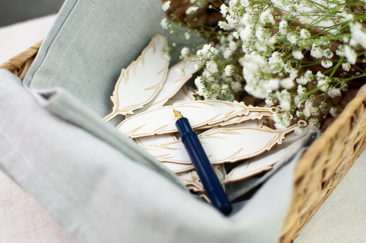 Księga gości w formie piórek, w zestawie znajduje się 20 szt., wymiary pojedynczego elementu 3,5 x 12 cm.