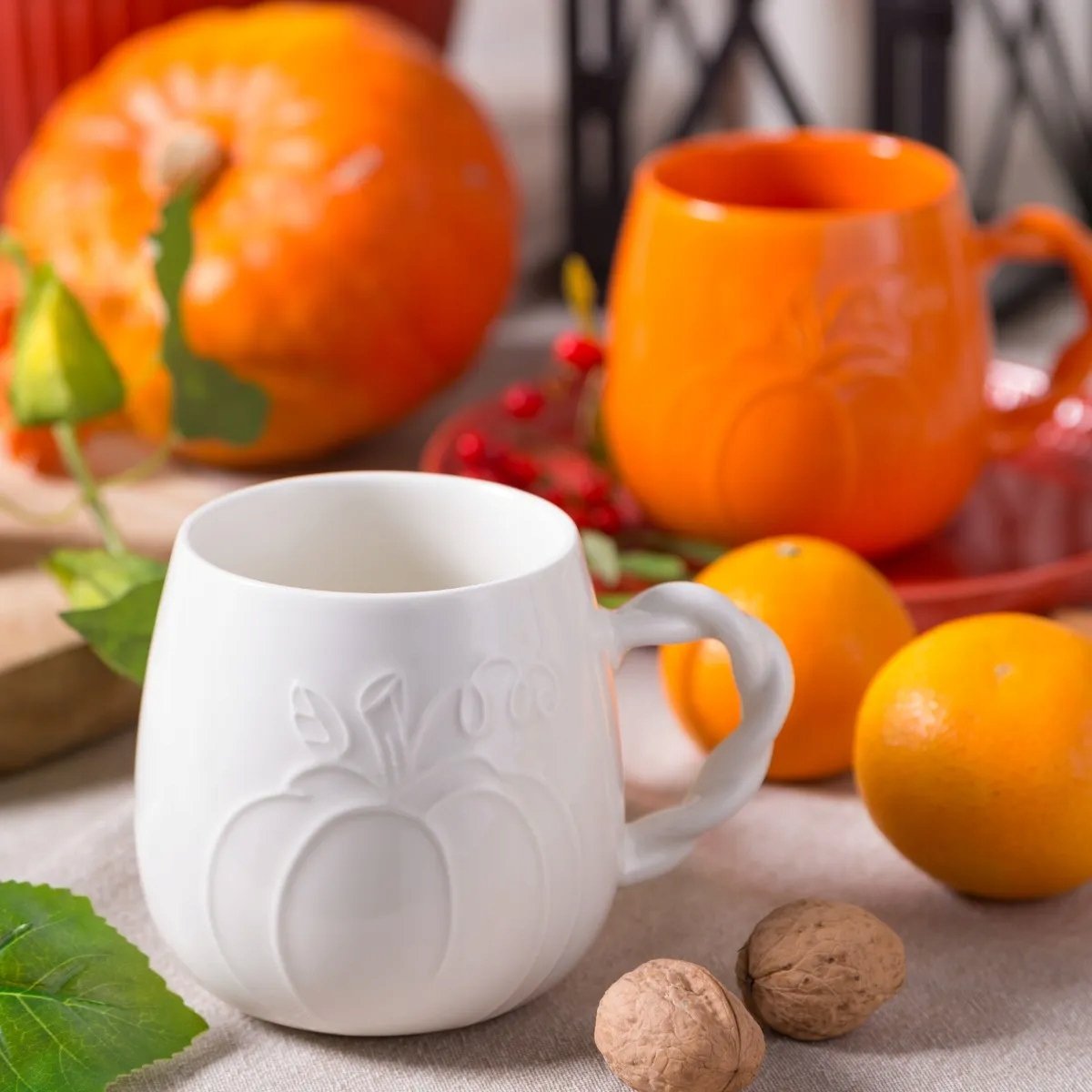 Kiedy robi się chłodniej, marzymy o kubku czegoś ciepłego - a ten model to jesienny ideał. Kremowy kubek z subtelnym tłoczeniem dyni i dekoracyjnym, plecionym uchem łączy w sobie elegancję i nutkę przytulności. Ma aż 510 ml pojemności, więc pomieści solidną porcję herbaty z imbirem, dyniowego latte albo aromatycznej zupy krem. Wykonany z porcelany New Bone China, jest trwały, wygodny i pięknie prezentuje się na stole - solo lub w duecie z wersją pomarańczową. Jesień? Z takim kubkiem zdecydowanie na tak!