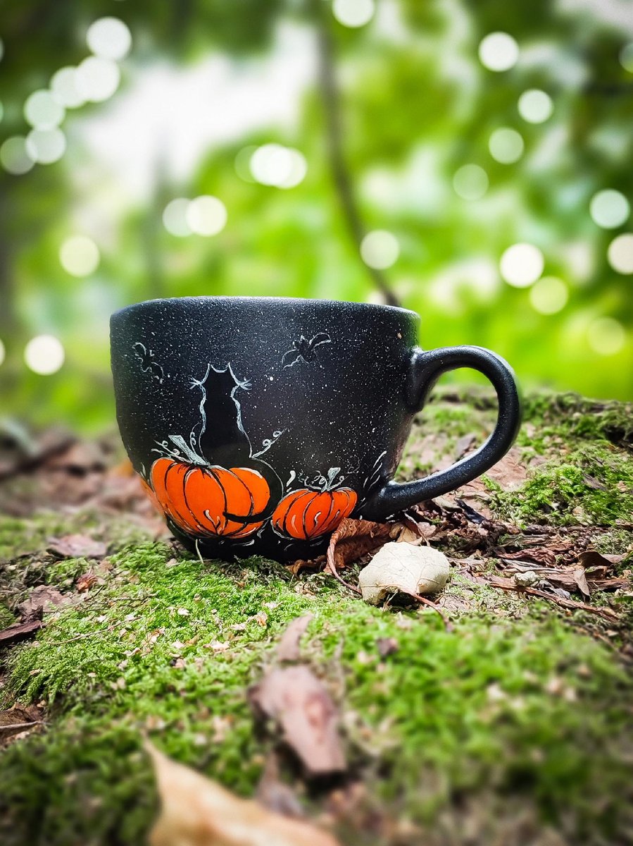 Ten uroczy kubek 500 ml na Halloween z pewnością przyciągnie uwagę miłośników kotów i święta Halloween. Został ręcznie malowany w szarym kolorze, a na nim przedstawiony jest motyw kota siedzącego na dyni, która ma wycięty uśmiech zębami. Całość tworzy klimatyczny i niepowtarzalny design, który na pewno sprawi, że picie ulubionej herbaty czy kawy będzie jeszcze przyjemniejsze. Kubek został wykonany z trwałych materiałów, a jego pojemność wynosi 500 ml.
