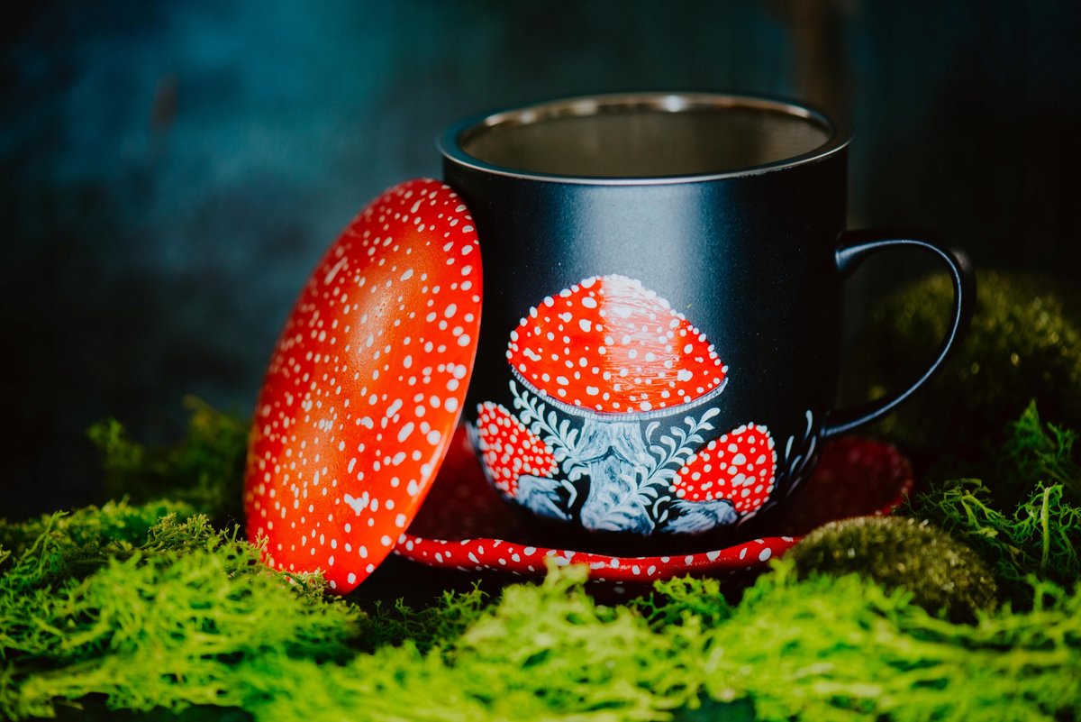 Kubek malowany z motywem leśnego muchomora i podkładka