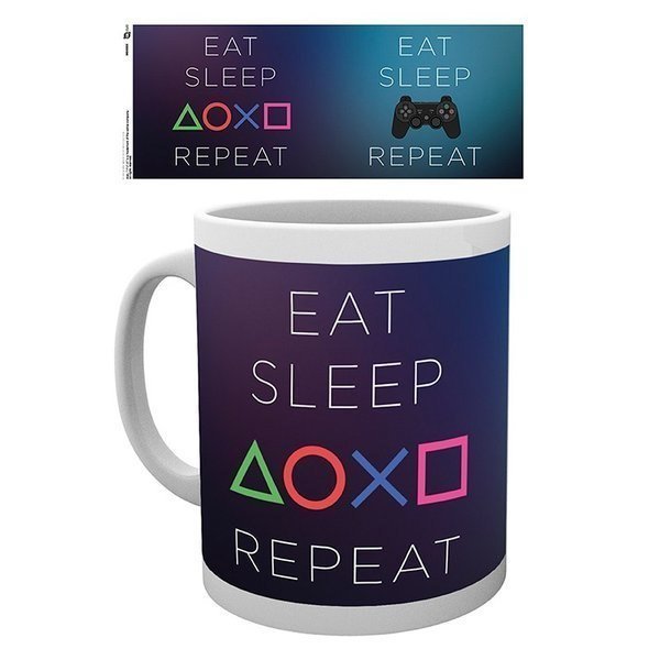 "Eat, Sleep, Repeat" - motto, które gracze dobrze znają! Tym razem na kubku z motywem Playstation. Kubek z wysokiej jakości ceramiki. Standardowy rozmiar (320 ml). Opakowanie: pudełko z