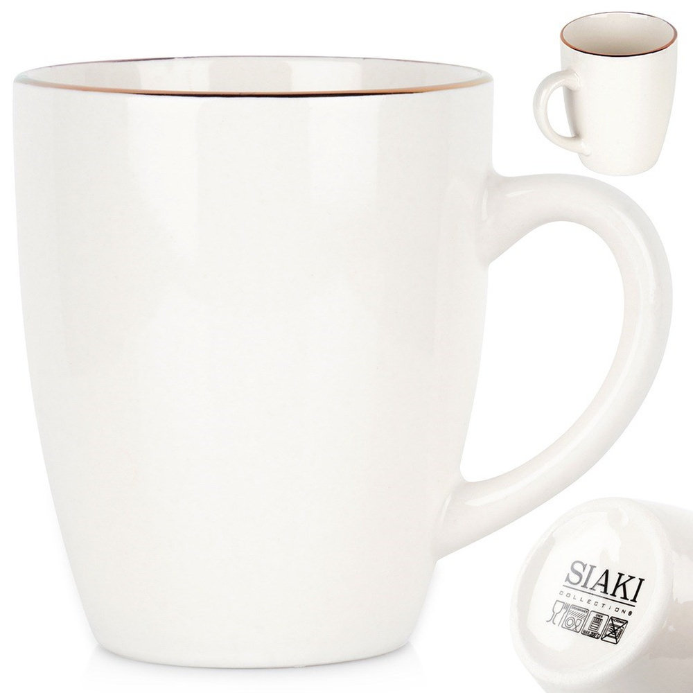 Biały kubek ze złotym zdobieniem do picia kawy, herbaty i napojów. Prosty i klasyczny kształt sprawia, że kubek jest bardzo wygodny w użytkowaniu. Idealnie sprawdzi się w użytku domowym. Świetnie komponuje się z dowolną zastawą stołową. Wyprodukowano zgodnie z europejskimi standardami.