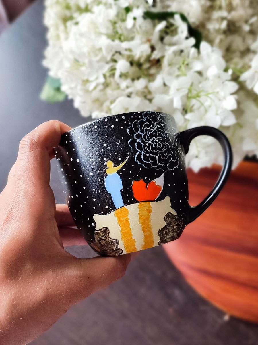 Kubek ręcznie malowany z motywem małego księcia.Kubek posiada pokrywkę z zaparzaczem350 mlTo wspaniały prezent dla tych co kochają celebrować wspólny czas pijąc wyjątkową herbatę lub ulubione zioła. ...