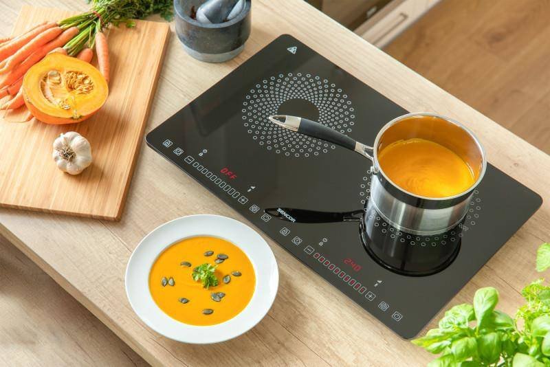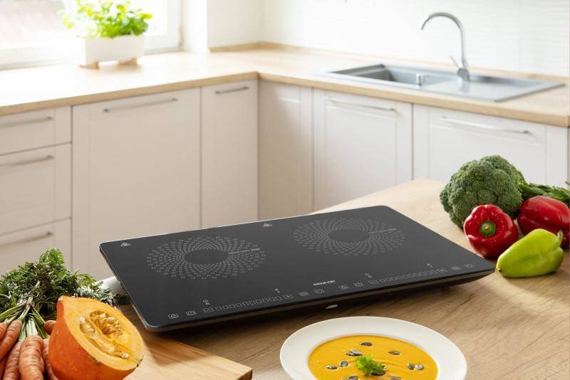 SCP 4501BK Kuchenka indukcyjna Moc: 1400W + 2000W Liczba palników: 2 Średnia palnika: 26 cm Roczaj płyty: ceramiczna / Slim 4,3cm Timer: 0-180 min / Regulacja temperatury 60-240st.C / Auto wykrywanie naczyń / Sterowanie dotykowe / LCD