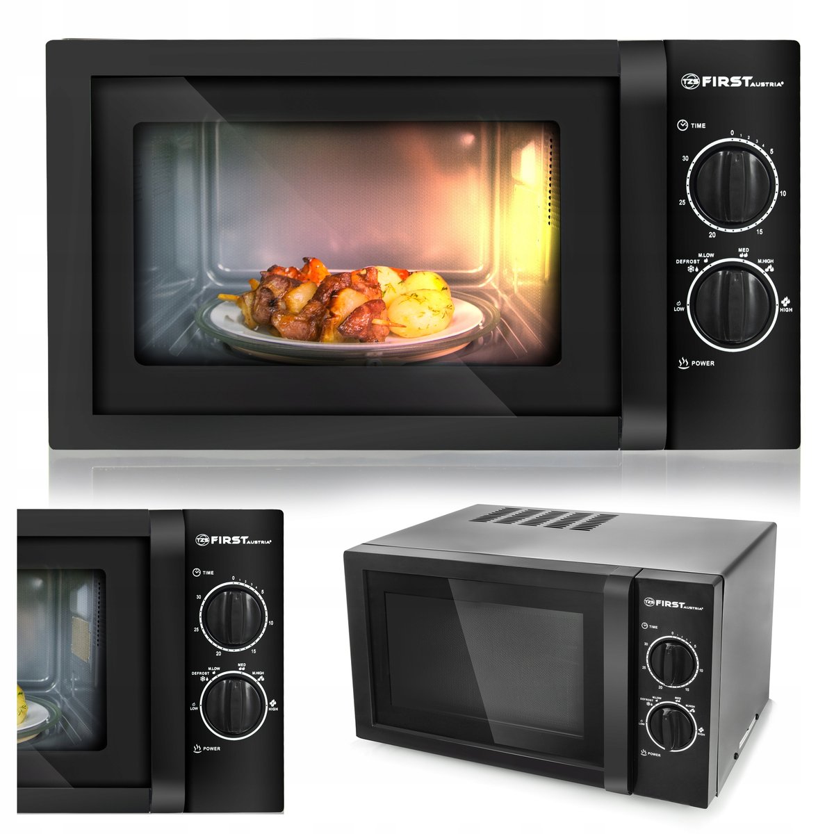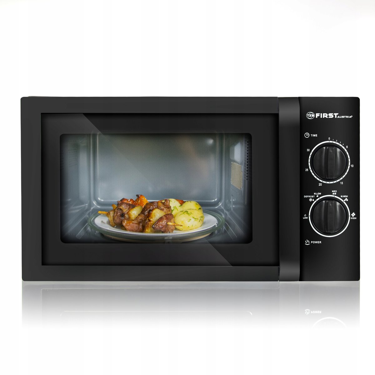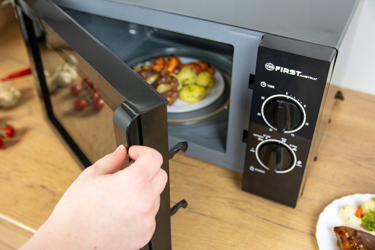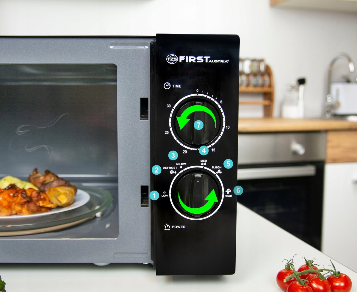 Dzięki mikrofalówce First Austria podgrzejesz większość posiłków w krótkim czasie: zupy, napoje, potrawy, a nawet rozmrozisz mięso czy też owoce.