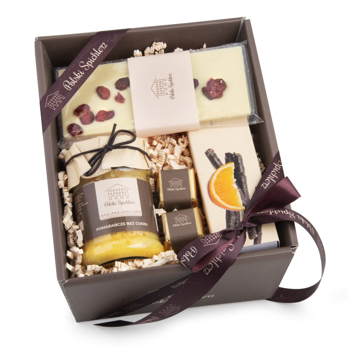 Co zawiera zestaw? Pomarańcze bez cukru 260ml Aromatyczna, wykwintna czekolada biała z dodatkiem żurawiny 100g Paluszki z czekolady deserowej o smaku miętowym 75g Czekoladki Polski Spichlerz