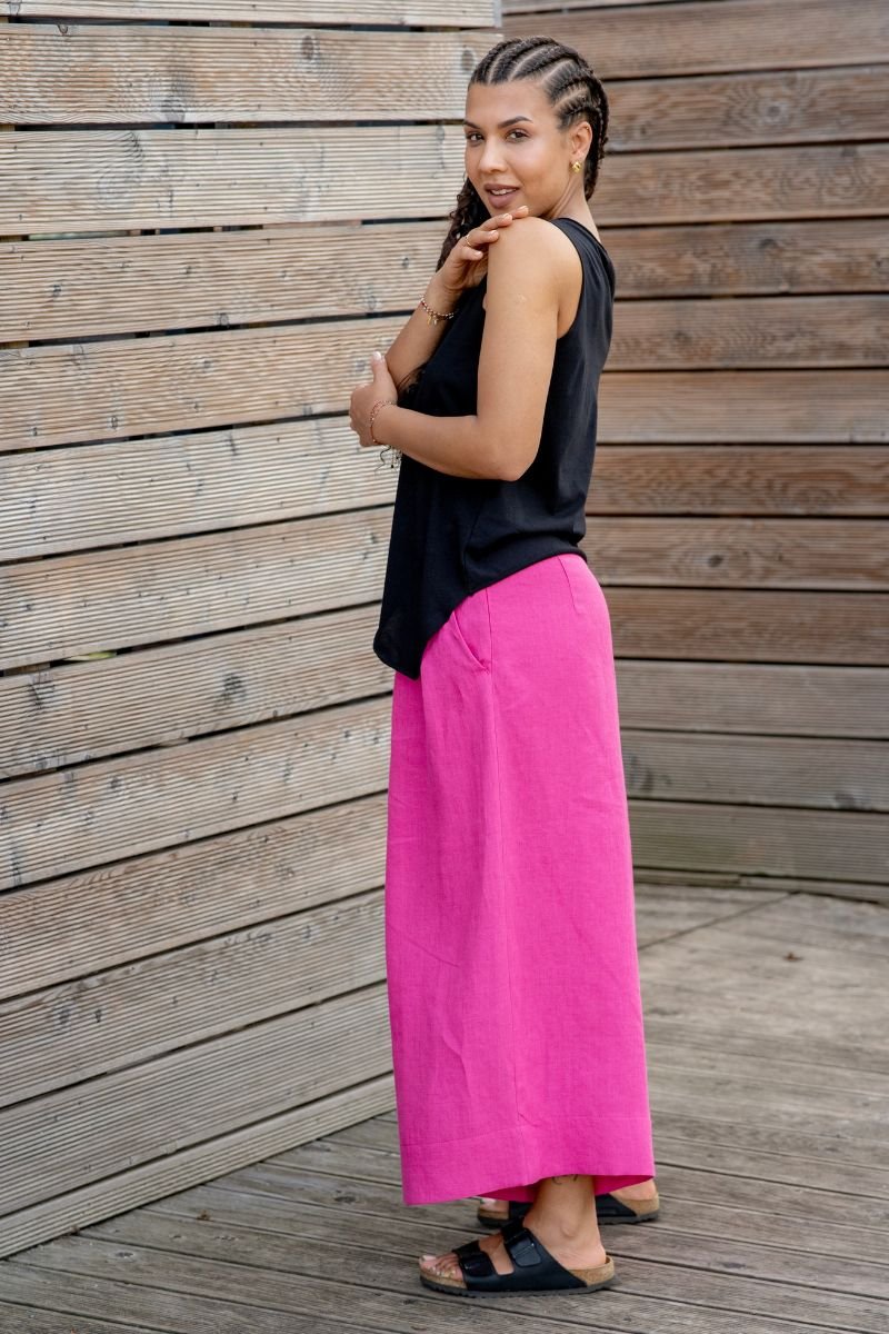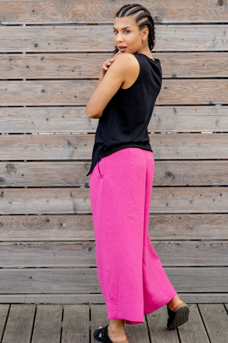Dzięki dopasowaniu od pasa do bioder, kuloty świetnie układają się na sylwetce, a ich szerokie, delikatnie falujące nogawki tworzą efekt, jakbyśmy mieli na sobie spódnicę. Dodaje im to lekkości i elegancji. Zakładki na przodzie optycznie wypłaszczają linię poniżej pasa, a z tyłu modelują kształt.