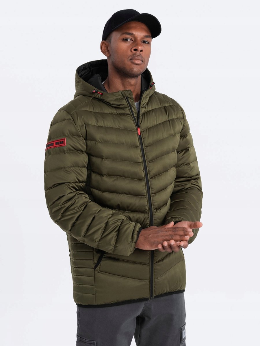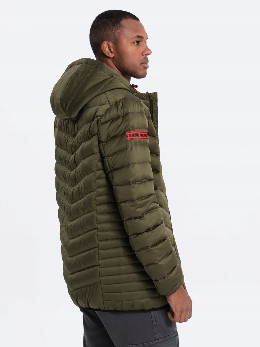 Kurtka męska pikowana o satynowym wykończeniu - ciemnooliwkowa V13 OM-JALP-0121 S