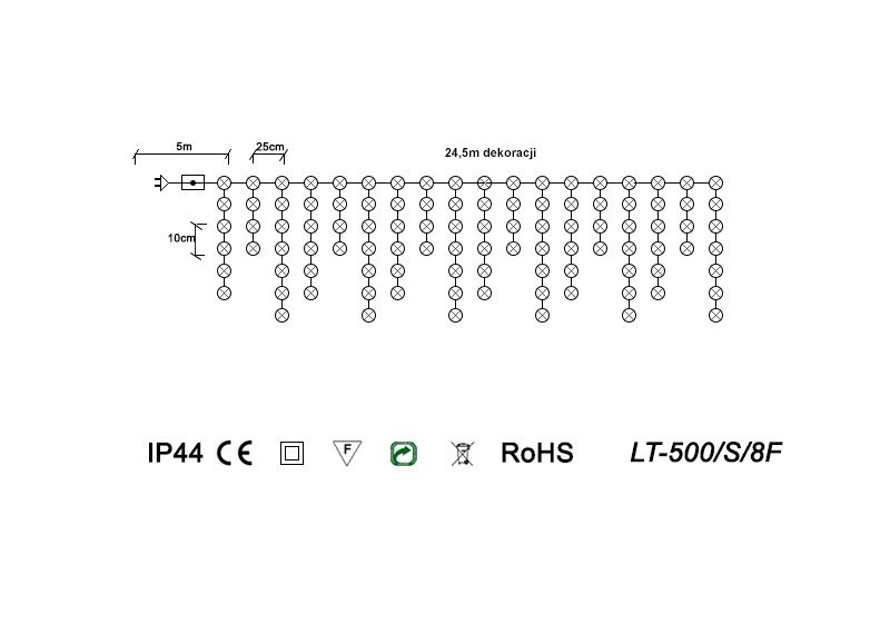 Kurtyna sople LED500/S/8F o dokładnej długości sznura 24,5 m, szczegółowa specyfikacja techniczna znajduje się w schemacie poniżej tekstu.