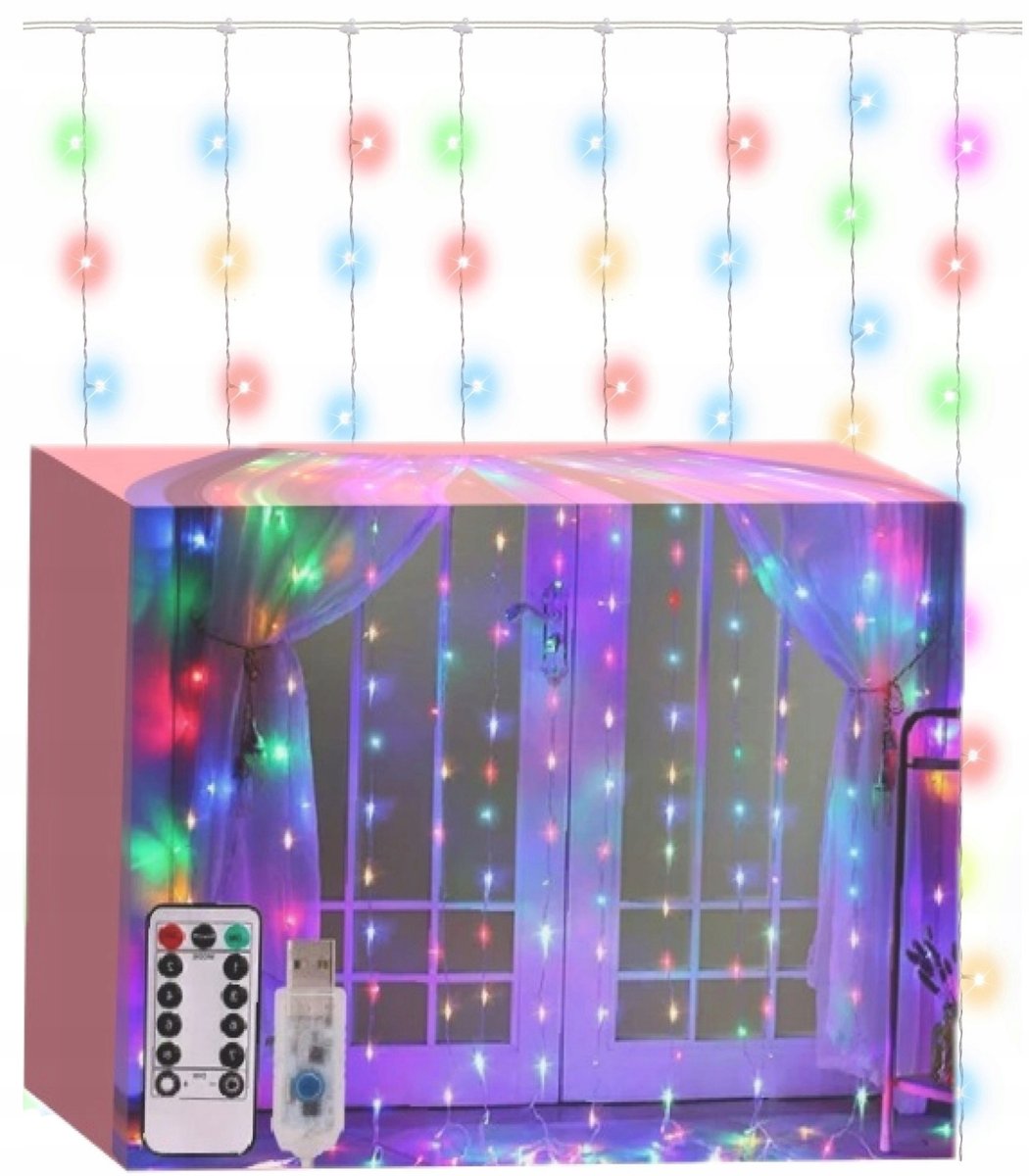 KURTYNA ŚWIETLNA 200 LEDKOLOROWA 2m X 2m + HACZYKIKurtyna świetlna złożona z 10 pionowo zwisających przewodów na których umieszczone są diody mikro LED - przepiękny efekt końcowyIdealny w ...