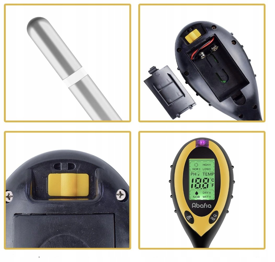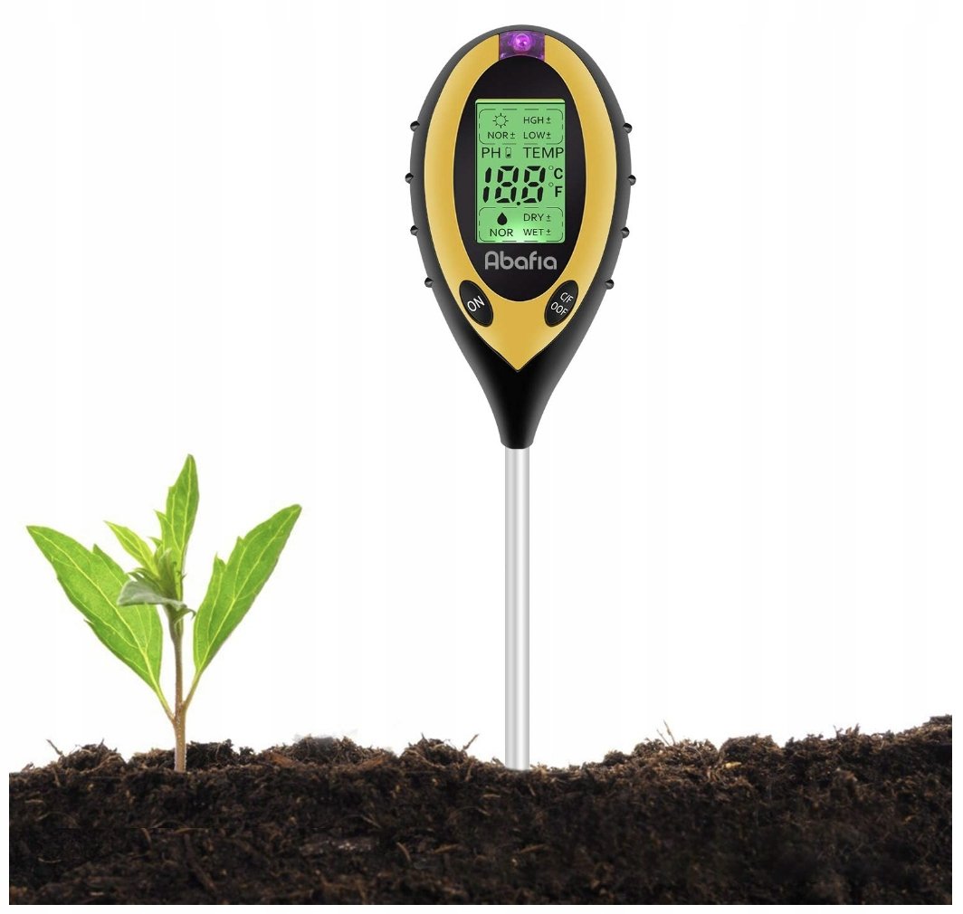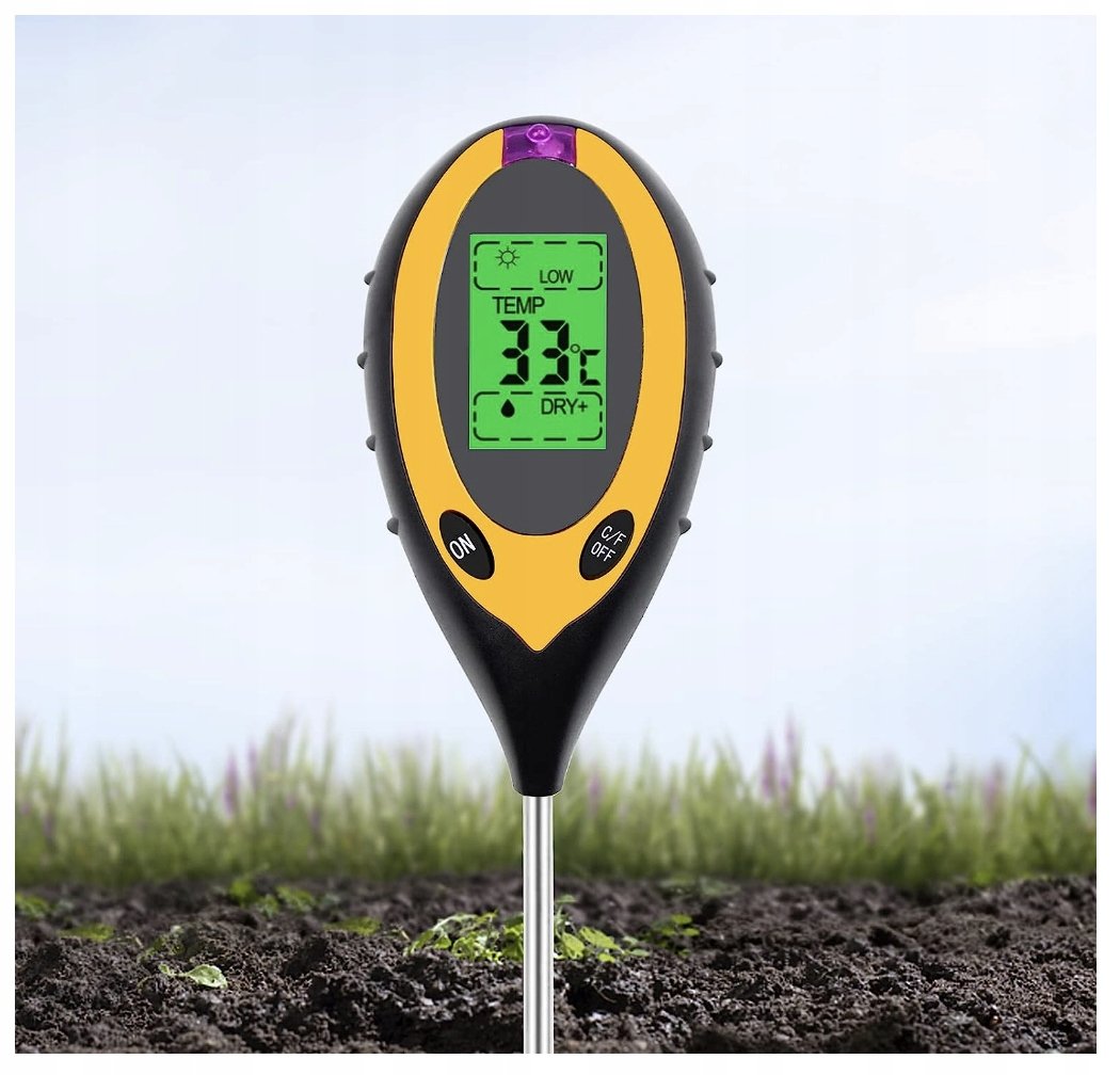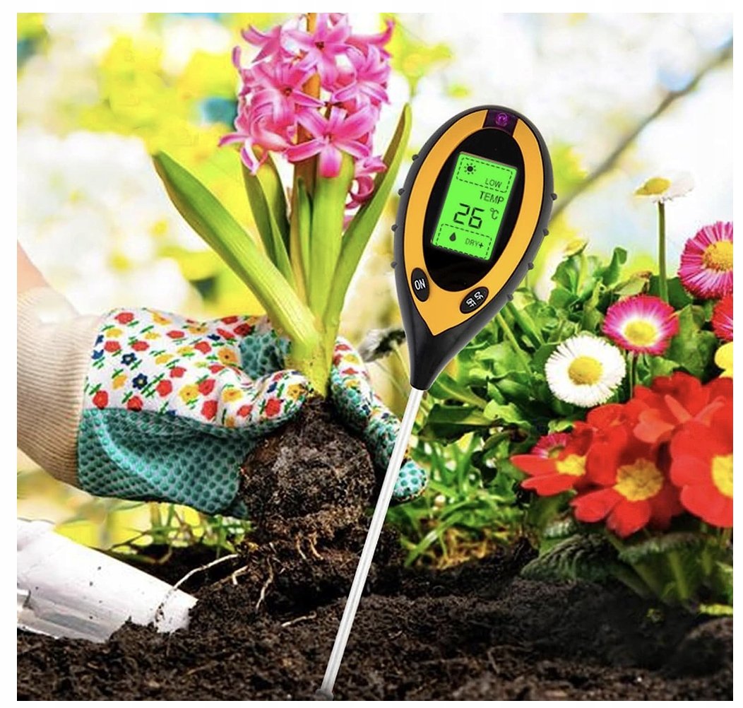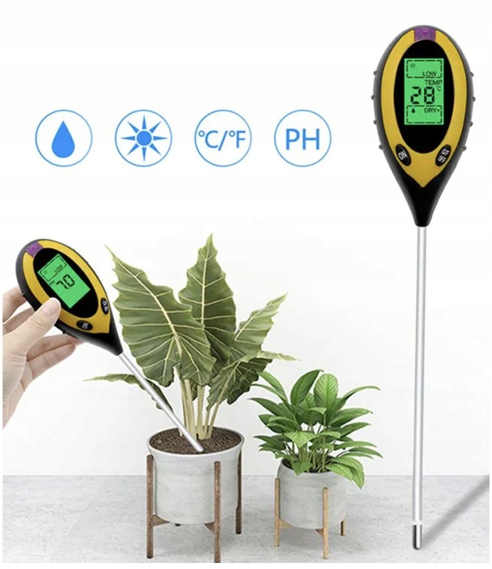 - 4 w 1: Kwasomierz, wilgotnościomierz, termometr glebowy, nasłonecznieniomierz