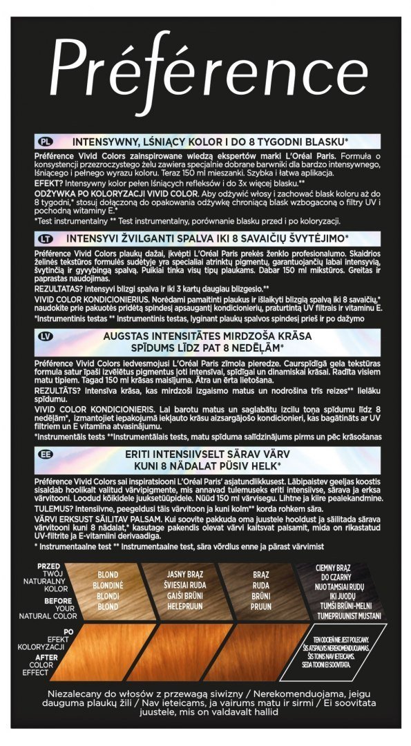 Préférence Vivid Colors zainspirowane wiedzą ekspertów marki L'Oréal Paris. Formuła o konsystencji przezroczystego żelu zawiera specjalnie dobrane barwniki dla bardzo intensywnego, lśniącego i pełnego wyrazu koloru. Szybka i prosta aplikacja. Użyj odżywki po koloryzacji Vivid Color, aby odżywić włosy i zachować blask koloru aż do 8 tygodni*.